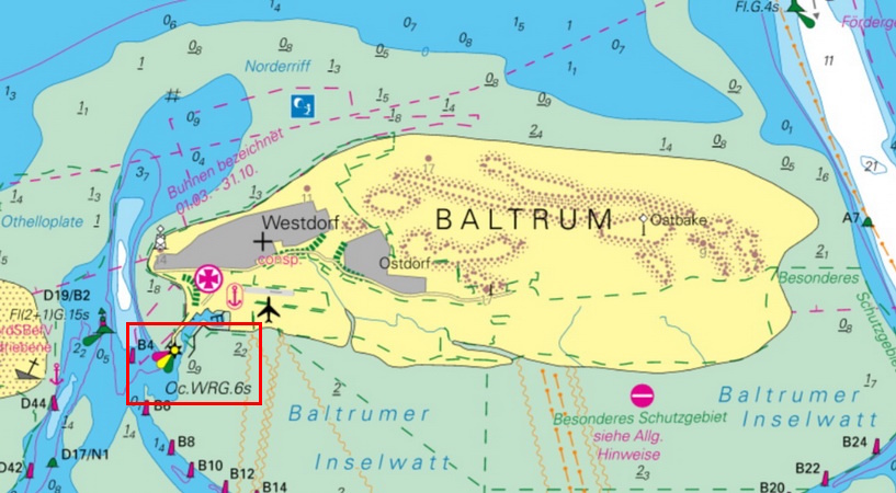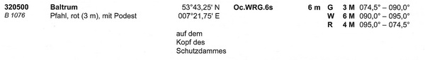 Das Hafeneinfahrtsfeuer (Lfv 320500; INT B1076) des Hafens Baltrum ist ausgefallen