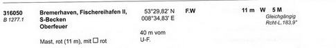Fischereihafen II- Südbecken (Unterfeuer, B 1257) Geogr. Lage: 53°30′N, 8°35′O Fischereihafen II- Südbecken (Oberfeuer,B 1257.1) Kennung: F.Richtfeuerlinie 188° |