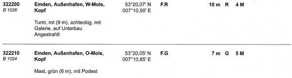 der Ems, von denen das Unterfeuer weißes, unterbrochenes, das Oberfeuer weißes Festfeuer zeigt,