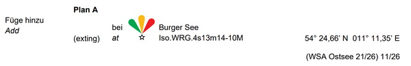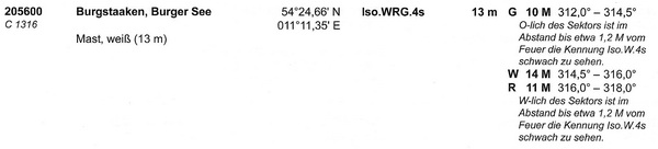 Auf Grund eines technischen Defekts ist das Sektorenfeuer Burger See (Lfd. Nr. 205600) bis auf weiteres