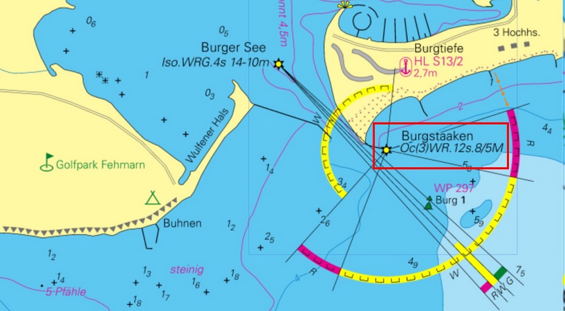 Am Kopfe der Ostmole in der Einfahrt in den Burger See steht eine rote Bake mit rotem Balltoppzeichen..." |