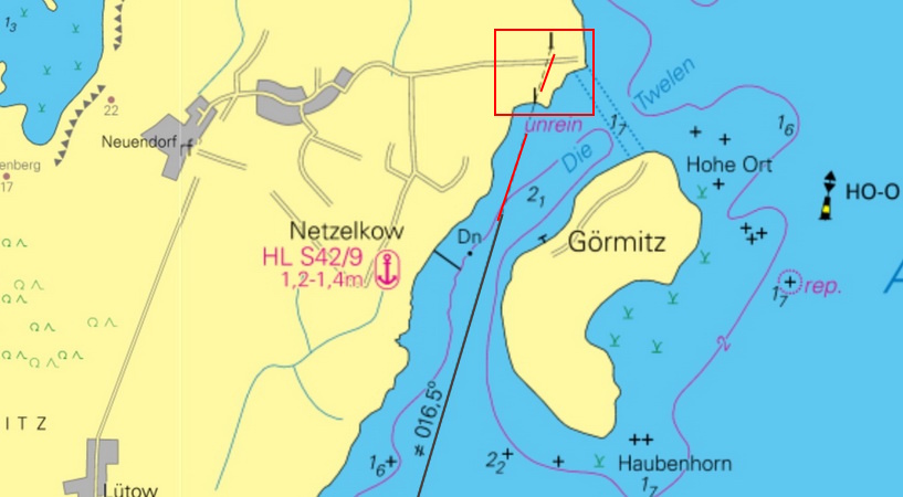 Streiche: Leitfeuer Görmitz auf 54°01,1´N 13°55,4´E. |