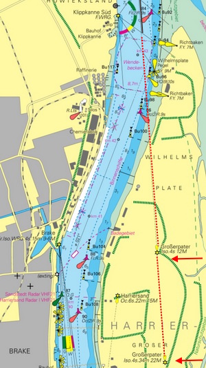 Die Richtungslinie der Feuer vom Großen Pater in S5/8W führt vom 50 km-Stein bis zur Wilhelmsplate