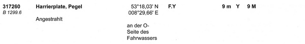 ![]() Pegel Harrierplate (B 1299.6) Geogr. Lage: 53°18´N 008°30´E Kennung: F. Y. Höhe über Wasser: 8 m Angestrahlter Dalben mit gelben Mast |