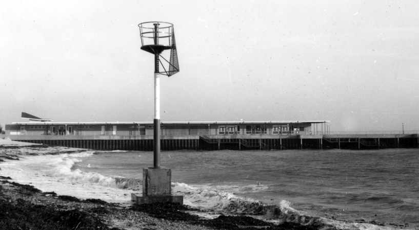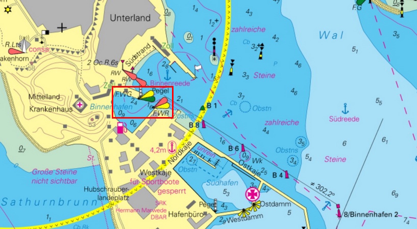 Angaben: rot-weiß gestreifter Mast mit ▽ (6 m), 50 m vom Unterfeuer