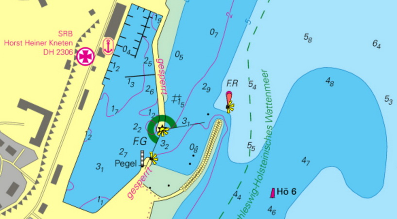 Karteneintragung:O-lich und S-lich der Schutzmole im Abstand von 10 m eine Gefahrengrenze.