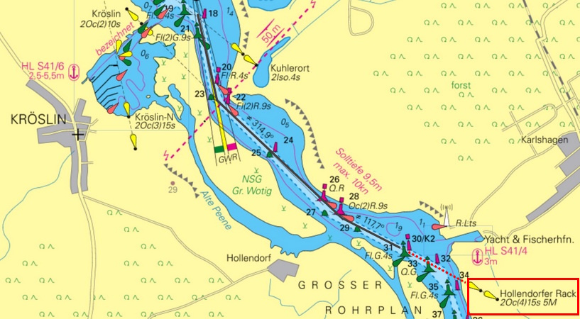 Unterfeuer Hollendorfer Rack (C 2659.46) Geogr. Lage: 54°06´N 13°49´E Kennung: Ubr. (4) 15 s Höhe über Wasser: 8 m Höhe über Erdboden: 7 m Tragweite: 9 sm Angaben: weiße Gitterbake mit weiß-schwarz umrandetem △ Oberfeuer Hollendorfer Rack (C 2659.47) Geogr. Lage: 54°06´N 13°49´E Kennung: Ubr. (4) 15 s Höhe über Wasser: 11 m Höhe über Erdboden: 11 m Tragweite: 9 sm Angaben: weiße Gitterbake mit weiß-rot umrandetem ▽, 100 m vom Unterfeuer. Richtfeuerlinie 117,7° gleichgängig. |