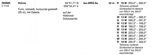 Holnis (C 1134) Position: 54°52´N, 9°34´E Kennung: F. w/r/gn + Blz.-3s + Blz.(4)-15s Nenn-TW: 13/10/9 sm Höhe: 32 m Angaben: Rot-weißer waagerecht gestreifter Turm mit Galerie (26 m), auf der Halbinsel Schausende. |
