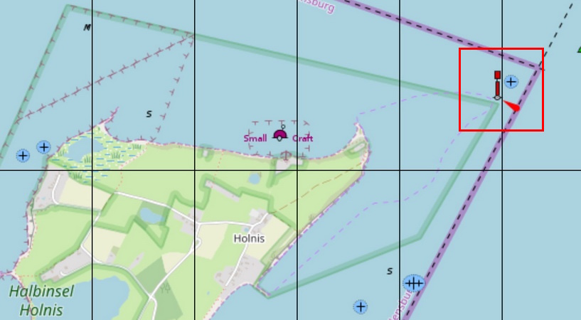 Streiche die Bake auf der Position 54°52,61´N 009°36,81´E |