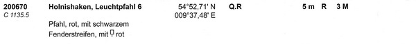 Holnis (C 1134) Position: 54°52´N, 9°34´E Kennung: Iso. WRG. 6 s Nenn-TW: 13/10/11 M Höhe über Wasser: 32 m Höhe über Erdboden: 26 m Angaben: Rot-weißer waagerecht gestreifter Turm mit Galerie. ![]() |