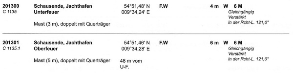 Unterfeuer Schausende (201300 / C1135) Position: 54°51,48;N, 009°34,24´E Kennung: F.W. Tragweite: 6 M Höhe über Wasser: 4 m Höhe über Erdboden: 3 m Angaben: Mast, doppelt mit Querträger Oberfeuer Schausende (201301 / C1135.1) Position: 54°51,46;N, 009°34,28´E, 48m vom Unterfeuer Kennung: F.W. Tragweite: 6 M Höhe über Wasser: 6 m Höhe über Erdboden: 5 m Angaben: Mast, doppelt mit Querträger |