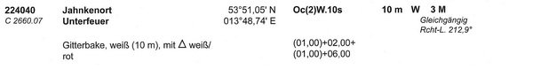 ![]() Unterfeuer Jahnkendorf Position: 53°51´N, 13°49´E Kennung: Oc (2) 10 s Nenn-TW: 9 M Höhe über Wasser: 10 m Höhe über Erdboden: 10 m Angaben: weiße Gitterbake mit weiß-rot umrandetem △ ![]() Oberfeuer Jahnkendorf Position: 53°51´N, 13°49´E Kennung: Oc (2) 10 s Nenn-TW: 9 M Höhe über Wasser: 17 m Höhe über Erdboden: 13 m Angaben: weiße Gitterbake mit weiß-rot umrandeten ▽, 150 m vom Unterfeuer. Foto: G.Liedtke 2005 ![]() |