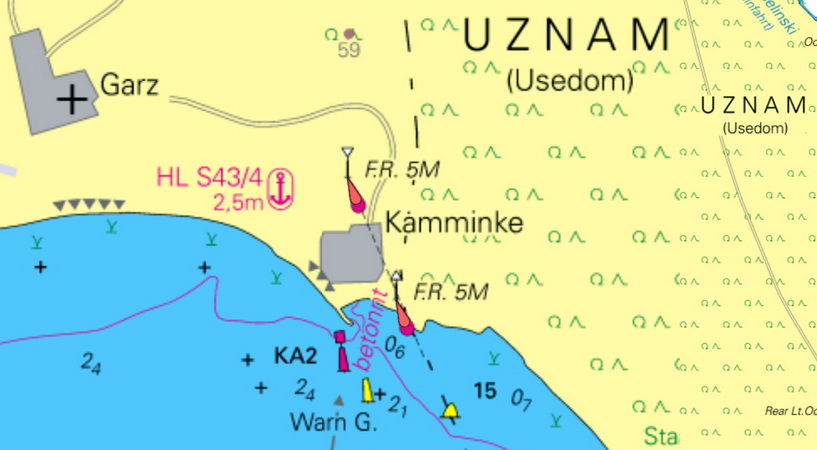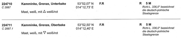 Die Baken in Kamminke dienen zusammen mit einigen Tonnen auf dem Haff und einem Bakenpaar in Altwarp ausschließlich der Bezeichnung der nördlichen Grenze zwischen Deutschland und Polen. Zu DDR-Zeiten wurden diese Grenzzeichen vom Rat des Bezirkes Rostock errichtet und verwaltet. Im Jahre 1990 wurden sie vom WSA Stralsund übernommen. Höhe der Baken: Unterbake: 17,3 m |