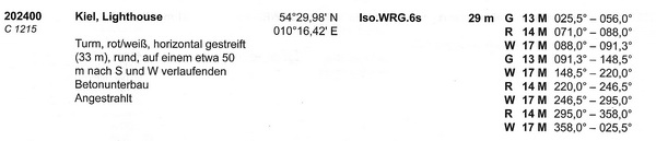 Ersetze Sektoren des Feuers Kiel auf 54°30,0´N 010°16,4´E durch R 071,0°-088,0°G 025,5°-056,0°, übrige Sektoren unverändert.