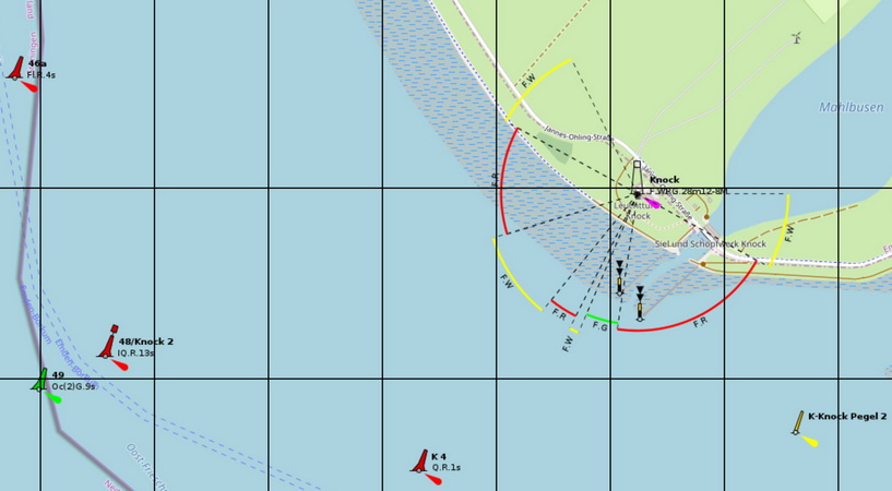 Knock (No. 464) Geogr. Lage: 53°20´25´´N 7°2´48´´O Kennung: F. w. & r. (Petroleum) Feuerhöhe über Hochwasser: 9 m Turmhöhe über Erdboden: 5,3 m Angaben: Grauer, runder, eiserner Turm |