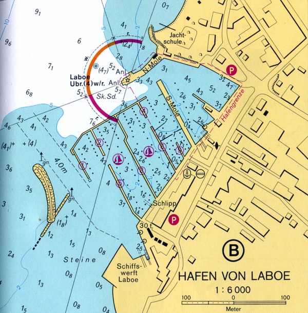 Labö (Nr. 936), auf dem Kopf der N-Mole Geogr. Lage: 54°24´18´´N 10°13´11´´O Kennung: F. r. (El.) Feuerhöhe über Hochwasser: 3,3 m Turmhöhe über Erdboden: 2,4 m Angaben: Weißer, eiserner Ständer