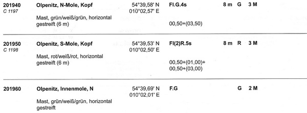 Anmerkung: Wegen Bauarbeiten (neue Stromversorgung) werden die beiden Molenfeuer sowie die jeweilige Anstrahlung in