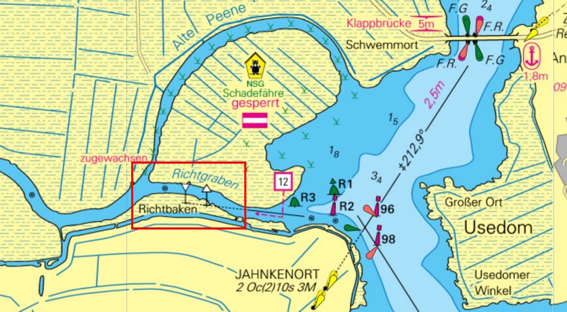 beiden kleinen Baken am südlichen Ufer des Richt Grabens in Linie. Dieser Leitmarke folgend, passirt man an