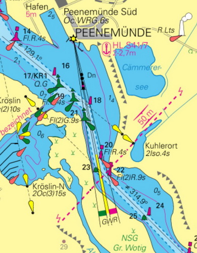 Für die weitere Entwicklung des Wolgaster Hafens mußte der Peenestrom auf einer Länge von 24 km neu ausgebaut werden. Die nun in der Breite und Tiefe veränderte Fahrrinne erforderte eine Anpassung der vorhandenen Leuchtfeuer. |