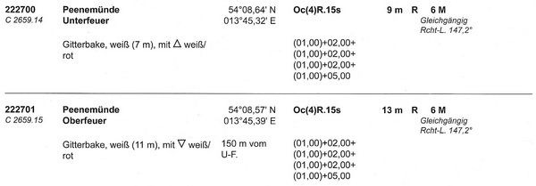 Geogr. Lage: Ungf. 54°8,7´N, 13°45,5´O., etwa 150 m 148° vom Unterfeuer.