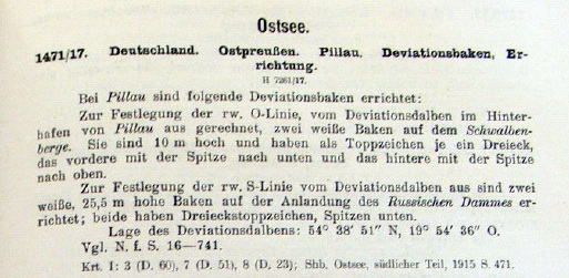 [Segel-Handbuch Ostsee, 1915] Zur Bestimmung der Fahrgeschwindigkeit von Torpedobooten ist südlich von Pillau auf der Frischen Nehrung eine Seemaile abgemerkt. Ihre Richtung liegt in der Deckpeilung des SW-Molenkopfes mit dem Leuchtturm auf dem NO-Molenkopfe des Hafens von Pillau. ![]() Die Deckpeilung des nördlichen Bakenpaares bezeichnet den Austritt aus der Meile oder Eintritt in dieselbe von SW. |