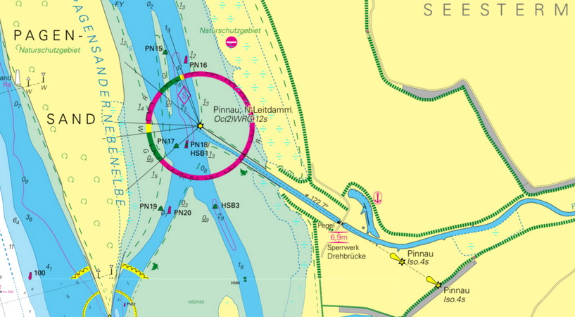 Unterfeuer Pinnau ( B 1515) Geogr. Lage: 53°40´N 9°34´E Kennung: Iso. 4 s Höhe über Wasser: 8 m Höhe über Erdboden: 8 m Tragweite: 6 Sm Angaben: Mast mit weiß-rot umrandetem △ am S-Ufer des Flusses