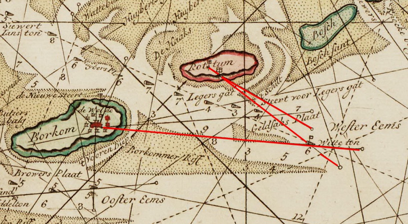 Die beiden Baken auf Rottum sind versetzt worden und stehen jetzt 626 m in der Richtung 143° (SO¾S)