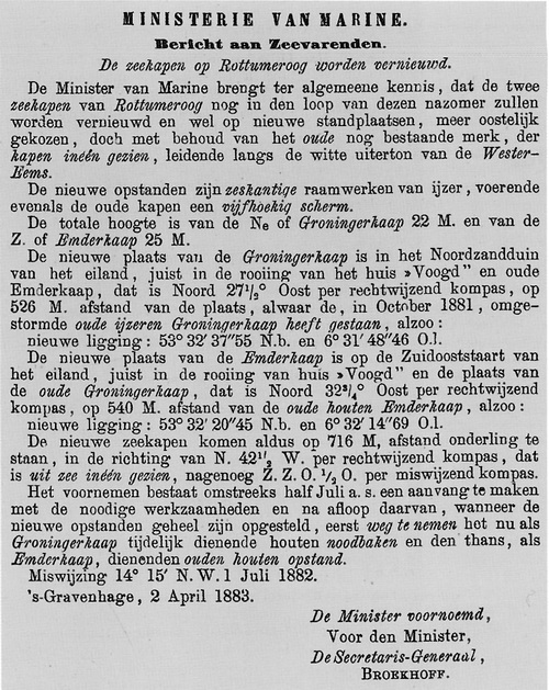 Bekanntmachung an die SeefahrerDie Leuchtfeuer von Rottumeroog werden erneuert. Der Marineminister bringt zur allgemeinen Kenntnis, dass die beiden Leuchtfeuer von Rottumeroog im Laufe dieses Sommers erneuert werden sollen und zwar an neuen Standorten, die weiter östlich liegen, jedoch unter Beibehaltung der noch bestehenden alten Kennzeichen, sodass die Leuchtfeuer, die entlang der weißen Dünen der Wattensee erscheinen, erkennbar bleiben. Die neu errichteten Bauwerke sind sechseckige eiserne Gittertürme, ebenso wie die alten Leuchtfeuer, und sind mit Dioptrik-Optiken ausgestattet. Die Gesamthöhe beträgt beim nördlichen Groningen-Kap 22 Meter und beim südlichen Eemder-Kap 25 Meter. Der neue Standort des Groninger Kap liegt in der Norddüne der Insel, genau in der Flucht des Vogt-Hauses und des alten Eemderkaps; er befindet sich Nord 271° Ost nach rechtweisendem Kompass, in 526 m Entfernung vom alten Standort, wo im Oktober 1881 das umgestürzte alte eiserne Groningerkap gestanden hat; also neue Lage: 53° 32' 37",55 N. Br. und 6° 31' 48",46 O. L. Der neue Standort des Emder Kap liegt an der Südostspitze der Insel, genau in der Flucht des Vogt-Hauses und des alten Groningerkaps; er befindet sich Süd 332° Ost nach rechtweisendem Kompass, in 540 m Entfernung vom alten Standort, wo das abgebrochene alte Emderkap gestanden hat; also neue Lage: 53° 32' 20",45 N. Br. und 6° 32' 14",69 O. L. Die neuen Leuchtfeuer kommen somit in 716 m Abstand voneinander zu stehen, in der Richtung Nord 42° West nach rechtweisendem Kompass, sodass sie gleichzeitig sichtbar sind, sogenannte Zwei- oder Doppellichter, je 1½° nach abweichendem Kompass. Die Inbetriebnahme ist für etwa Mitte Juli vorgesehen; vorläufig werden jedoch - während der notwendigen Arbeiten und bis zum Abschluss derselben - die neu errichteten Gebäude aufgestellt, zunächst weiterhin das bisher als Groningerkap dienende hölzerne Seezeichen sowie das bislang als Eemderkap dienende hölzerne Seezeichen verwendet. Missweisung 14° 15' Nordwest, Juli 1882. MINISTERIUM DER MARINE ´s-Gravenhage, 2. April 1883 Hölzerne Baken beseitigt