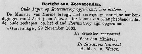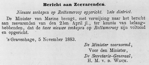 Bericht an SeefahrendeNeue Seezeichen auf Rottermoog errichtet. 1. Bezirk. Der Minister für Marine bringt hiermit den Bericht an die Seefahrenden vom 2. April d. J. zur Kenntnis, dass die zwei neuen Seezeichen auf Rottermoog vollständig errichtet worden sind. ´s-Gravenhage, 5. November 1883 Das