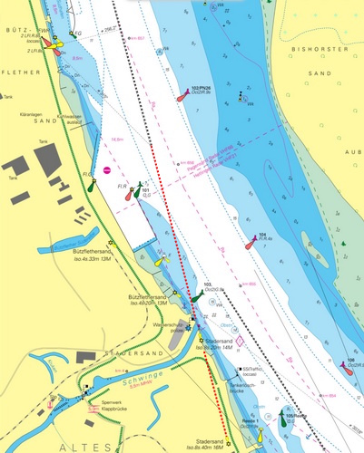 Pagensand-Richtlinie bis in den Leitsektor des Twielenfleth- Feuers. Die Feuerträger erhalten im Laufe des