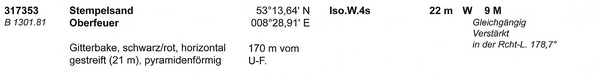 Oberfeuer Stempelsand (B 1301.81) Geogr. Lage: 53°14´N, 8°29´O, bei km 29,4 auf dem Elsflether Sand. Kennung: Glt. 4 s Feuerhöhe über Wasser: 22 m Feuerhöhe über Erdboden: 21 m Tragweite: 9 sm Feuerträger: Schwarze, pyramidenförmige Dreibeinbake mit verlattetem Oberteil. |