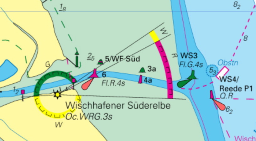 Anmerkung: Einsteuerung in die Wischhafener Süderelbe. Bei der Einfahrt ist der grüne bzw. rote