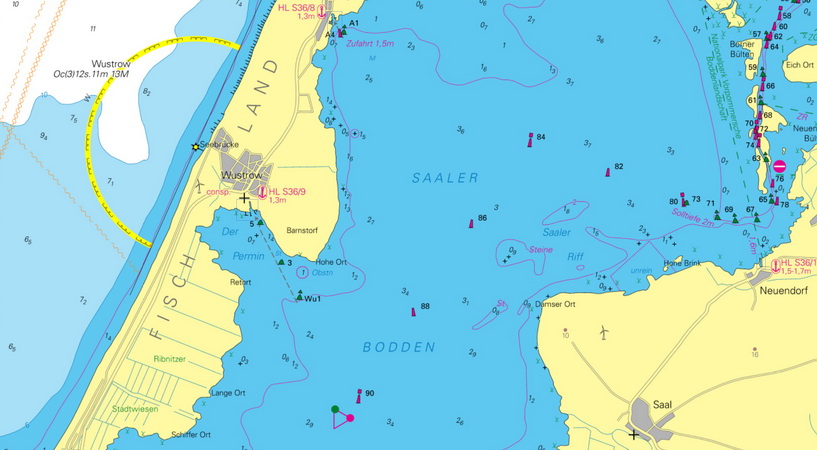 Auf der westlichen Hafenbegrenzung soll in den 60er (?) Jahren des vorigen Jahrhunderts eine Richtlinie bestanden haben. Die Bake wird mit einem Dreiecks-Toppzeichen, Spitze nach oben - also eine Unterbake, bezeichnet. ![]() ![]() ![]() ⇒ "Kapitänshaus" ![]() ![]() Schon immer waren die Wustrower Kirche und die Rettungsstelle Seezeichen, die immer noch in den Seekarten vermerkt sind. ![]() |