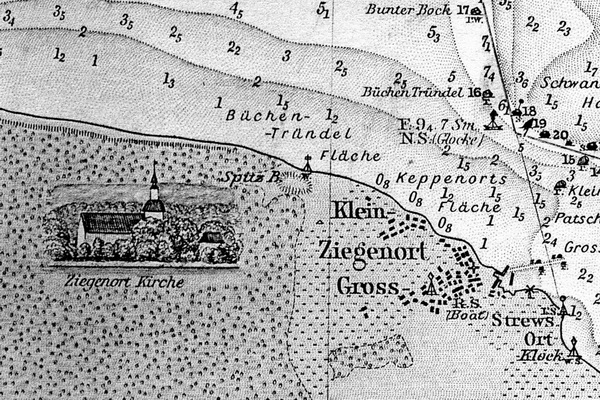 Mittellinie des nördlichen Fahrwassers nach dem Hafen von Ziegenort im Jahre 1888 errichteten Baken (vgl. No.
