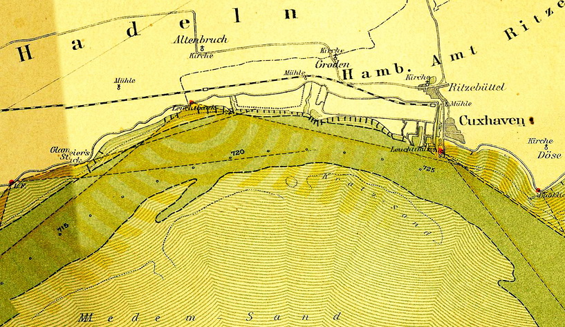 Groden ein festes Feuer und am Deich bei der Groden-Bake sowie am Eingange zum Hafen von Altenbruch je