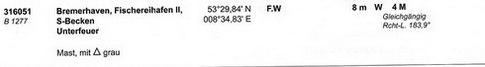 Fischereihafen II- Südbecken (Unterfeuer, B 1257) Geogr. Lage: 53°30′N, 8°35′O Fischereihafen II- Südbecken (Oberfeuer,B 1257.1) Kennung: F.Richtfeuerlinie 188° |