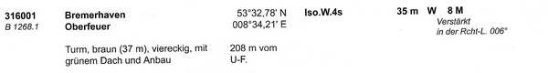 Bemerkungen: Richtfeuer, führen in Linie achteraus in rw. 6°, weseraufwärts bis zur Leuchttonne G