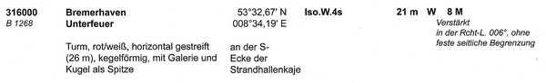 Bemerkungen: Richtfeuer führt mit dem Oberfeuer in Linie 6° achteraus weseraufwärts bis zur Leuchttonne