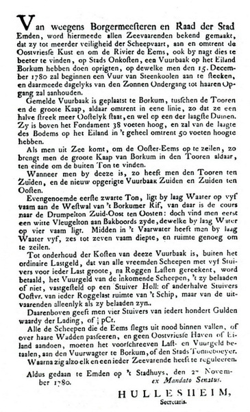 ostfriesischen Küsten, zu verschaffen, auch den Ems-Strom des Nachts desto besser finden und befahren zu können,