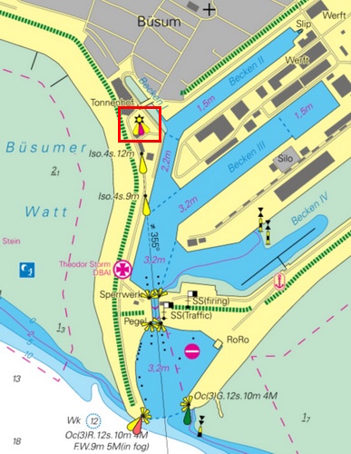 Der rothe Sektor bezeichnet mit seiner westlichen Grenze die Einfahrt in den Büsumer Hafenpriel und mit der