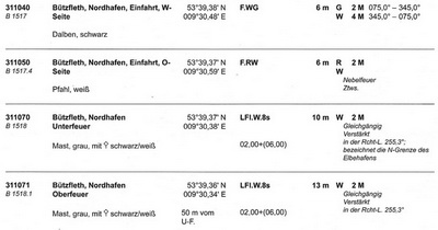 Die Daten der Einfahrtsfeuer sind wie folgt: