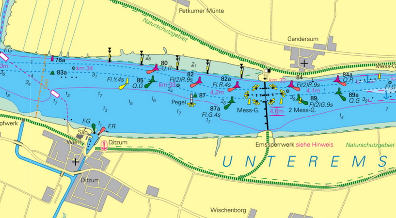 Ditzum (B1033/14430) Geogr. Lage: 53°19´N 007°17´E Kennung: Blz.-3s Höhe über Wasser: 5 m Höhe über Erdboden: 3 m Tragweite: 5 sm Angaben: Mast mit Umgang und zylindrischem Aufsatz, am Fähranleger |