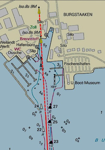 2) In der Baggerrinne durch den Burger See nach dem Hafen von Burgstaaken befinden sich an St-B. rothe Stangen