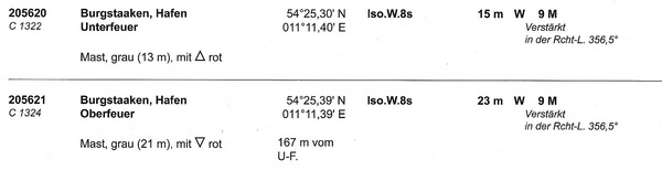 Unterfeuer Burgstaaken in Glt. 8s; 54°25,3´N, 11°11,5´E