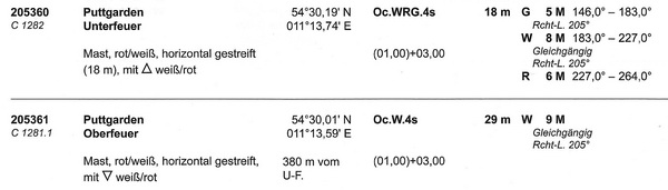 ![]() Unterfeuer Puttgarden (C1281) >Geogr. Lage: 54°30´N 11°14´O Kennung: Oc. WRG. 4s Feuerhöhe über Wasser: 18 m Angaben: Rot-weiß waagerecht gestreifter Mast mit weiß-rot umrandetem △ ![]() Oberfeuer Puttgarden (C1281.1) Geogr. Lage: 54°30´N 11°14´O Kennung: Oc. 4s Feuerhöhe über Wasser: 29 m Angaben: Rot-weiß waagerecht gestreifter Mast mit weiß-rot umrandetem ▽, 380 m vom Unterfeuer ![]() |
