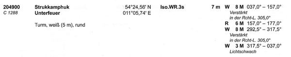 auf ungf. 54°25´N 11°7´O hat als Lichtquelle Flüssiggasglühlicht erhalten. Die Kennung des