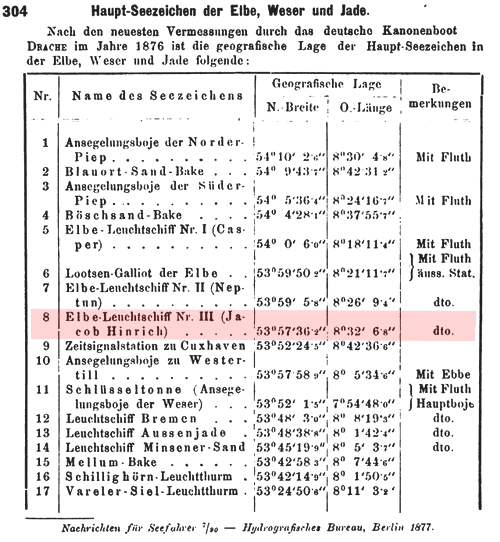 Angaben: Das Feuerschiff ist von 53°57´21,5´´N, 8°37´20´´O nach dem obigen
