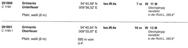 Die Richtfeuer Grimsnis (Lfv. lfd.Nr. 201800 und 201801) und Kappeln (Lfv. lfd.Nr. 201840 und 201841) sind ab