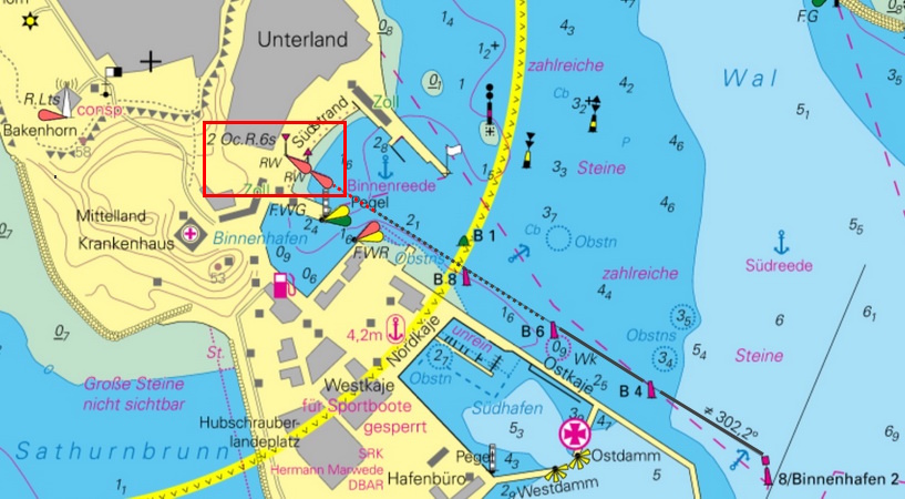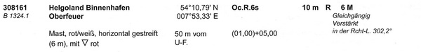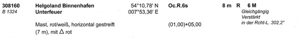 Angaben: rot-weiß gestreifter Mast mit ▽ (6 m), 50 m vom Unterfeuer
