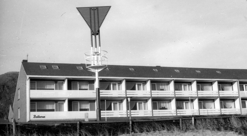 Feuerträger: 7,4 m hoher, rot-weiß waagerecht gestreifter Mast mit △.